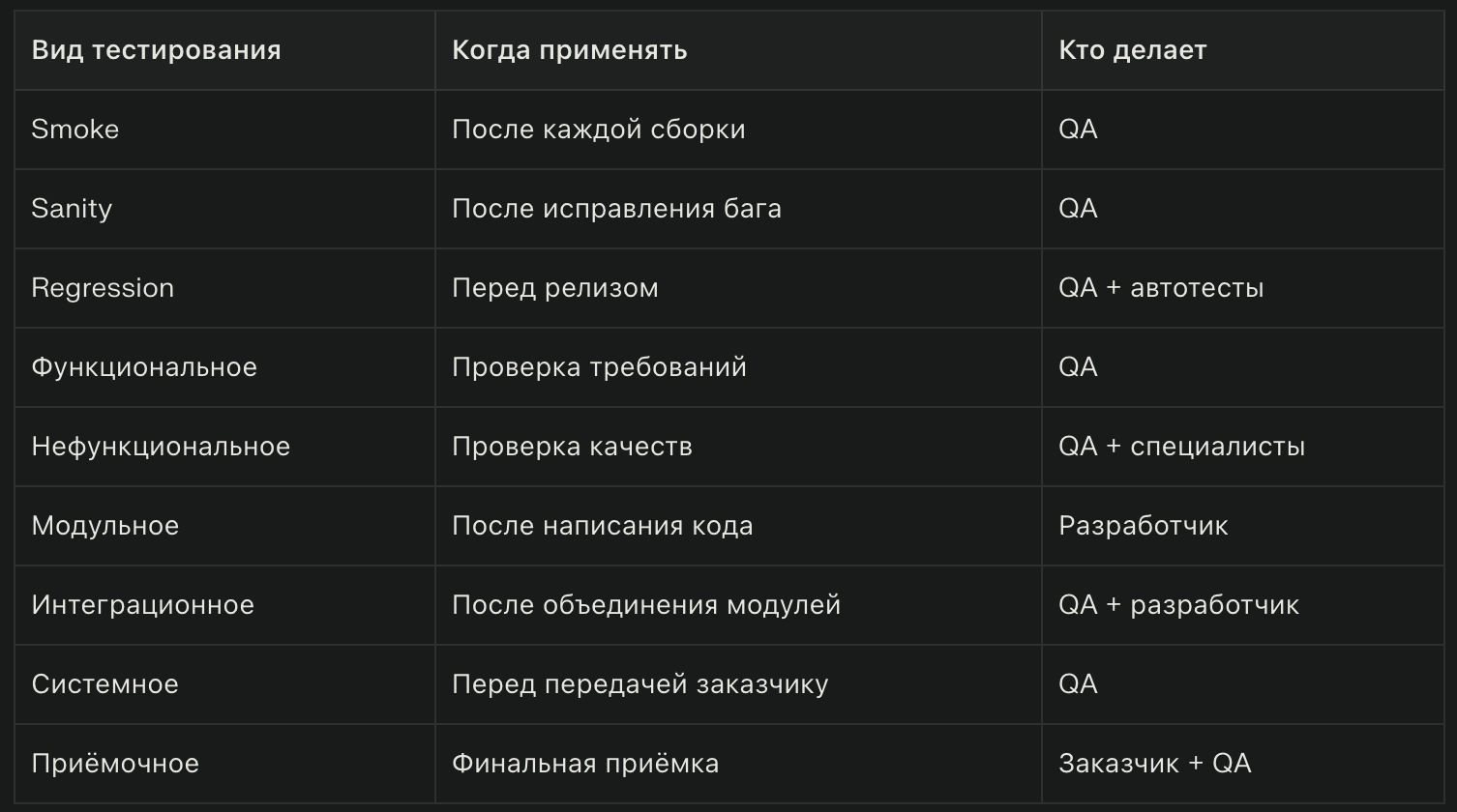 ✓ Научишься применять smoke, sanity, regression на практике